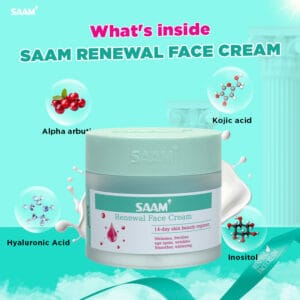 SAAM Renewal Face Cream is specifically formulated to address hyperpigmentation, addressing common concerns like brown spots, age spots and more. Its unique blend of Alpha Arbutin, Kojic Acid, and other premium ingredients work together to inhibit melanin production, gradually fading pigmentation and promoting a healthier skin tone.