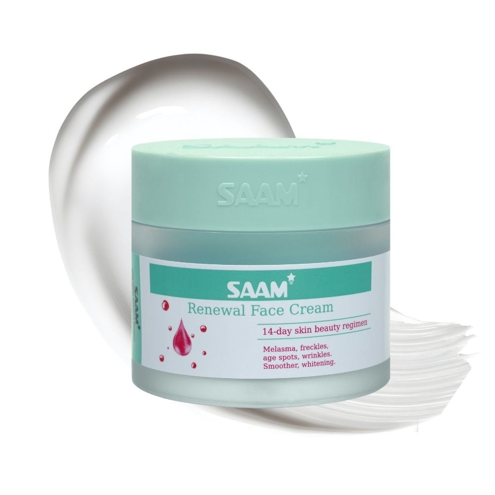 Experience radiant, even-toned skin with SAAM Renewal Face Cream. Our gentle formula targets hyperpigmentation issues, revealing a brighter, more beautiful look in 2 to 3 weeks.